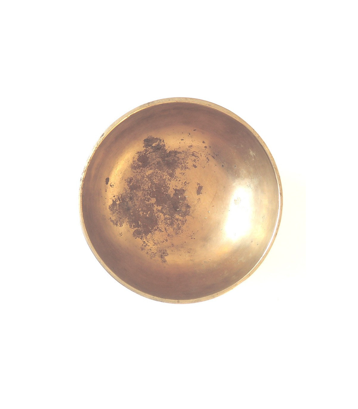 Este cuenco proviene de la región oriental de India, Nepal y Tibet. Su aleación es de siete metales y la forma es de taza o cazo (base plana y paredes rectas).
