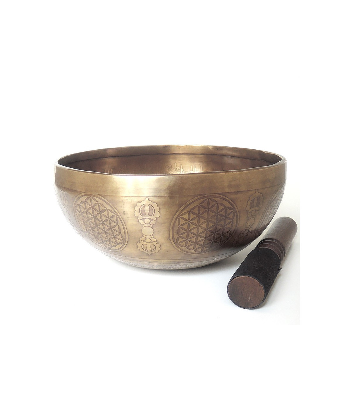 Cuenco cantor grabado realizado artesanalmente en la región de los Himalayas con aleación de 7 metales que le confieren una bella combinación de armónicos.