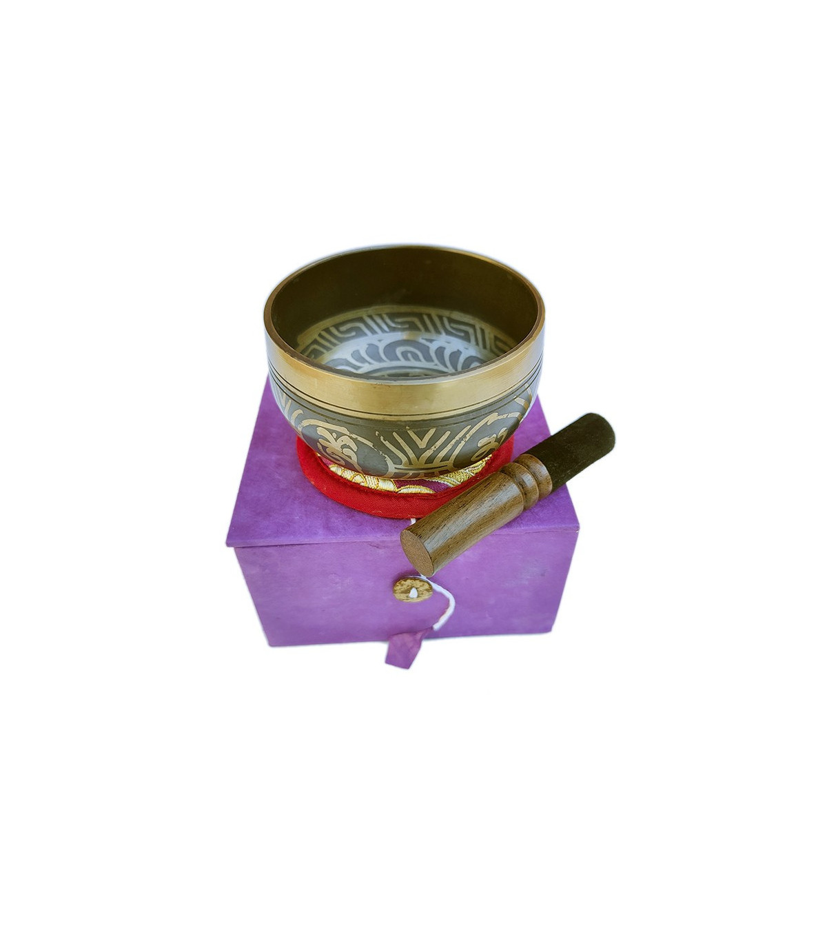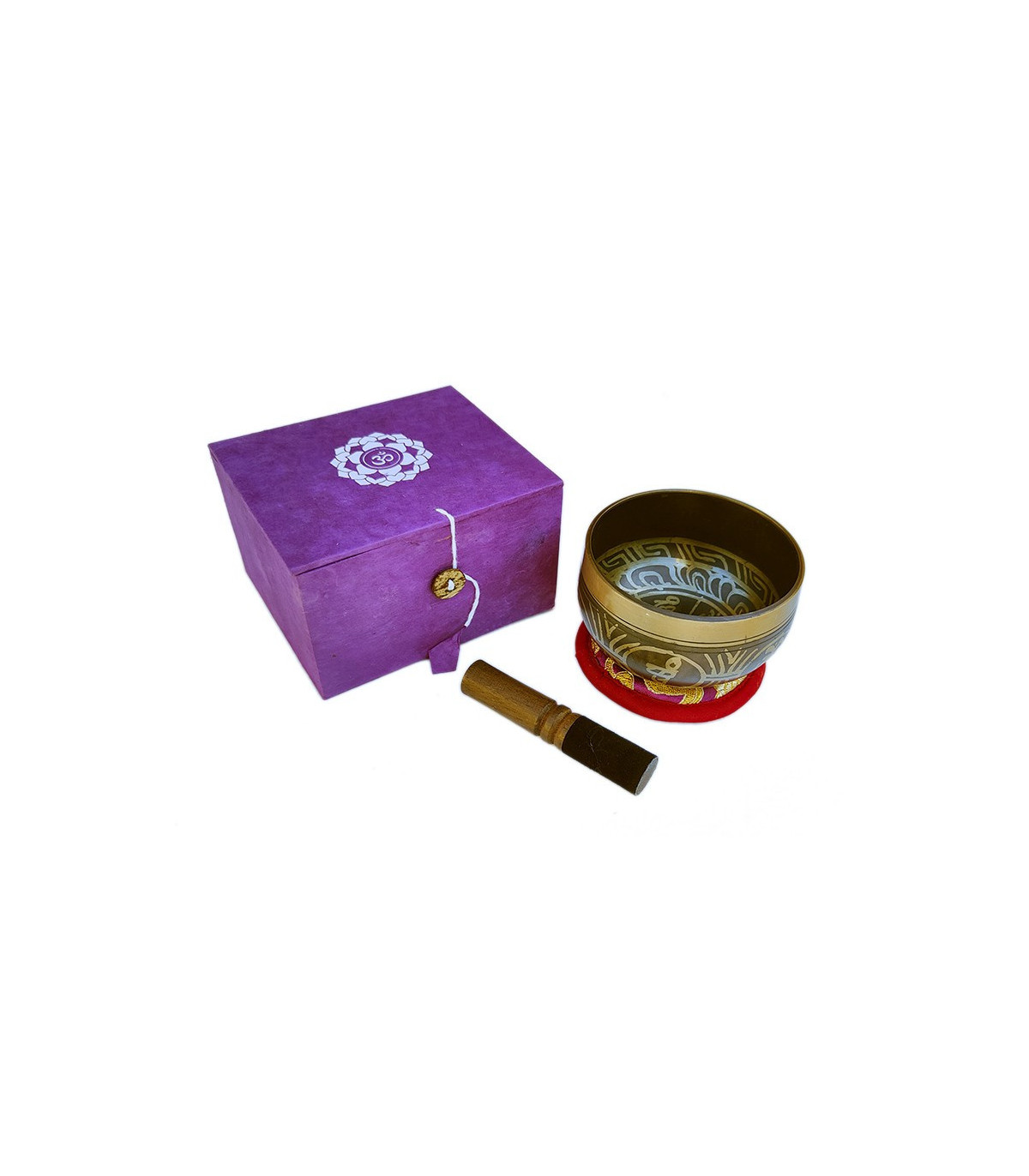 El pack incluye un Cuenco Tibetano de 8,3 cm fabricado en Nepal, una baqueta forrada con cuero, un cojín y una caja de regalo con el símbolo Om. Todos los cuencos han sido fabricados y seleccionados uno a uno por su calidad y consistencia sonora. Al percutirlo se genera un bello sonido para calmar, tranquilizar y relajar el cuerpo. El cuenco viene con todos los accesorios necesarios para tocarlo y guardarlo. Ideal para regalar a un amigo o ser querido. Perfecto para meditar y serenar la mente.
