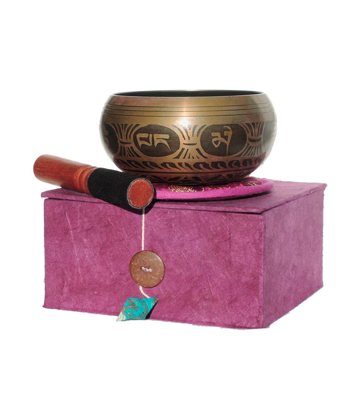 El pack incluye un Cuenco Tibetano de 10 cm fabricado en Nepal, una baqueta forrada con cuero, un cojín y una caja de regalo con el símbolo Om. Todos los cuencos han sido fabricados y seleccionados uno a uno por su calidad y consistencia sonora. Al percutirlo se genera un bello sonido para calmar, tranquilizar y relajar el cuerpo. El cuenco viene con todos los accesorios necesarios para tocarlo y guardarlo. Ideal para regalar a un amigo o ser querido. Al friccionar el borde genera un sonido limpio, sin estridencias. Perfecto para meditar y serenar la mente.