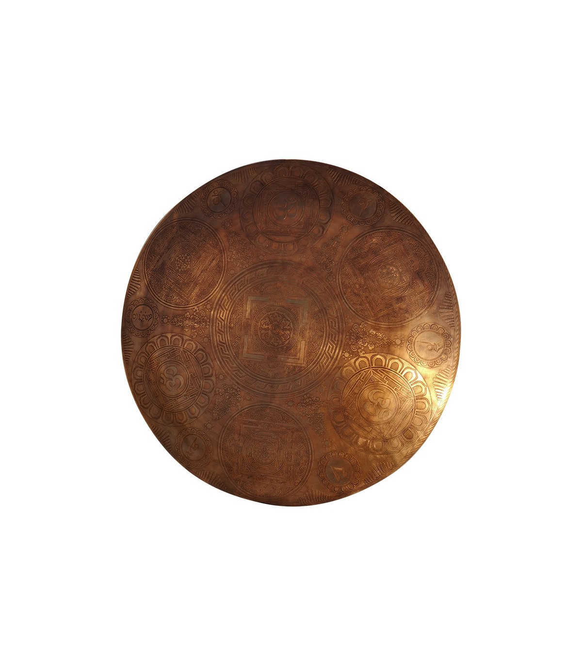 Gong nepalí fabricado artesanalmente en una aleación de 7 metales. Su acabado artesanal es plano en el centro y se va curvando hacia los bordes. Construcción elaborada y decorado con símbolos del Budismo Tibetano.