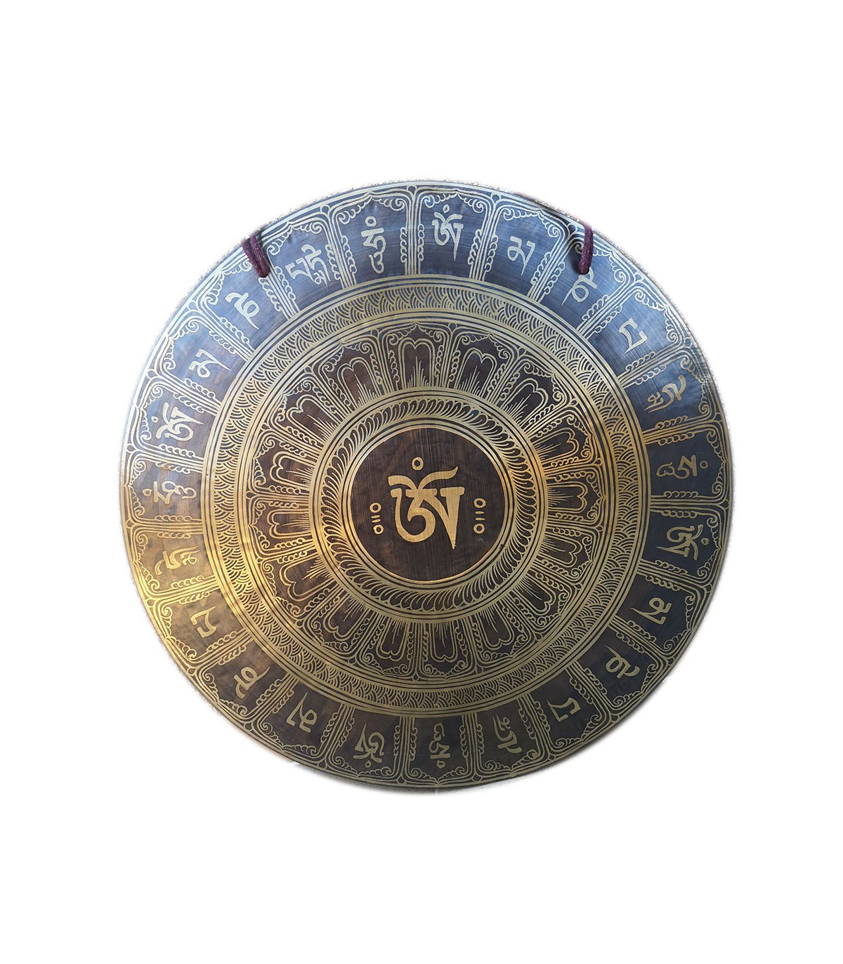 Gong nepalí fabricado artesanalmente en una aleación de 7 metales. Su acabado artesanal es plano en el centro y se va curvando hacia los bordes. Construcción elaborada y decorado con símbolos del Budismo Tibetano.